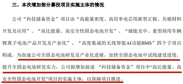 本次增加募投項目實施主體為孚能科技全資子公司廣州孚能科技有限公司(簡稱:廣州孚能)。“科技儲備資金”項目中“高比能量、高安全性固態電池開發”項目實施主體由變更前僅為公司,變更為孚能科技和廣州孚能。